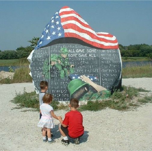 The Rock!!!! I'm told that there is a huge rock near a gravel pit on Hwy. 25 in Rural, Iowa. For generations, kids have painted slogans, names, and obscenities on this rock, changing it's character many times. A few months back, the rock received it's latest paint job, and since then it has been left completely undisturbed. It's quite an impressive sight. Be sure to scroll down and check out the multiple photos (all angles) of the rock. I thought the flag was draped over the rock, but it's not. It's actually painted on the rock too.
