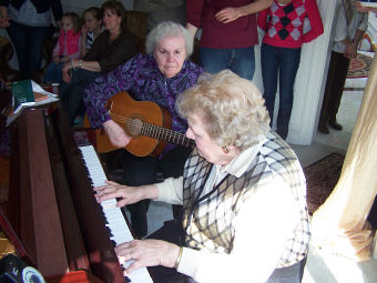 DATELINE: STORY BEHIND THE STORY As the birthday party got on the way, whispers between the guests could only anticipate what was to come later in the party. Although everyone wanted it to happen, it took one of Susan's children to get the long awaited reunion of Jean and Joan Schmelzer to perform as the duo "Jean & Joan". They started there career out in the 1940's with the help of Mr. DiSilva making song recordings for the boys overseas. Not since Christmas on North York Drive over 30 years ago, has this combination played together for an audience. It was a magical afternoon. Jean got behind the ivories, and Joan strapped on the guitar, and even Brad Savage got in on the act as they played "Your Cheatin' Heart". An encore followed immediately after the first lighter was lit (they didn't want to see Terry and Susan's house go up in flames again)