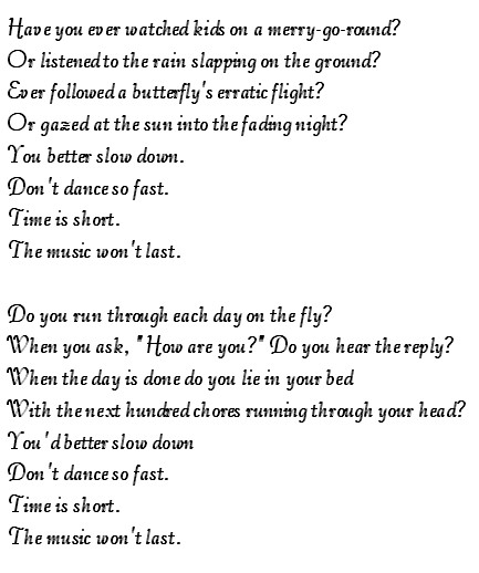 There is an old saying "Time Flies When Your Having Fun". Unfortunately, especially as I get older, it seems like it flies all the time. The days just seem to get sewn together, especially though the regimen of everyday life. That is why I really look forward to the "special times", like being with my brothers in Vegas, or traveling with Margaret to Oregon to visit, being with close friends and loved ones. I know we tend to "Stop, and smell the roses" when on vacation, but do we really realize that we should be doing that in our everyday life. With the days, that quickly turn into weeks, which quickly turn into months, I realize just how short life is, and one of my resolutions this year is to enjoy the "simple" things in life and not take things for granted. My final thought I leave you is a poem from the pen of psychologist and writer David L. Weatherford. Enjoy!
