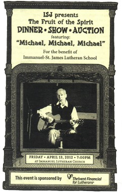 Yours truly did a one-man show recently about my klutzy past. The event was part of a fundraiser for Immanuel-St. James Lutheran School in Grand Rapids. My lyrics for the title song (as sung to the blues standard, "Alberta,